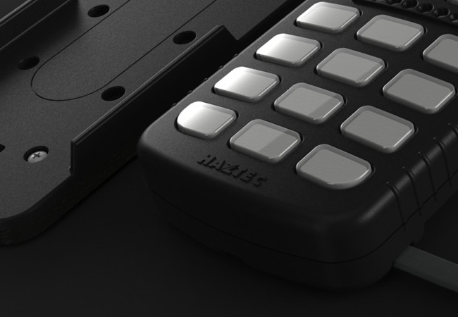 Large hand held lightbar controller with programmable buttons and microphone for lights and external speaker. Magnetically held to dashboard mounted base. Button legend easily customisable under removable transparent button covers.